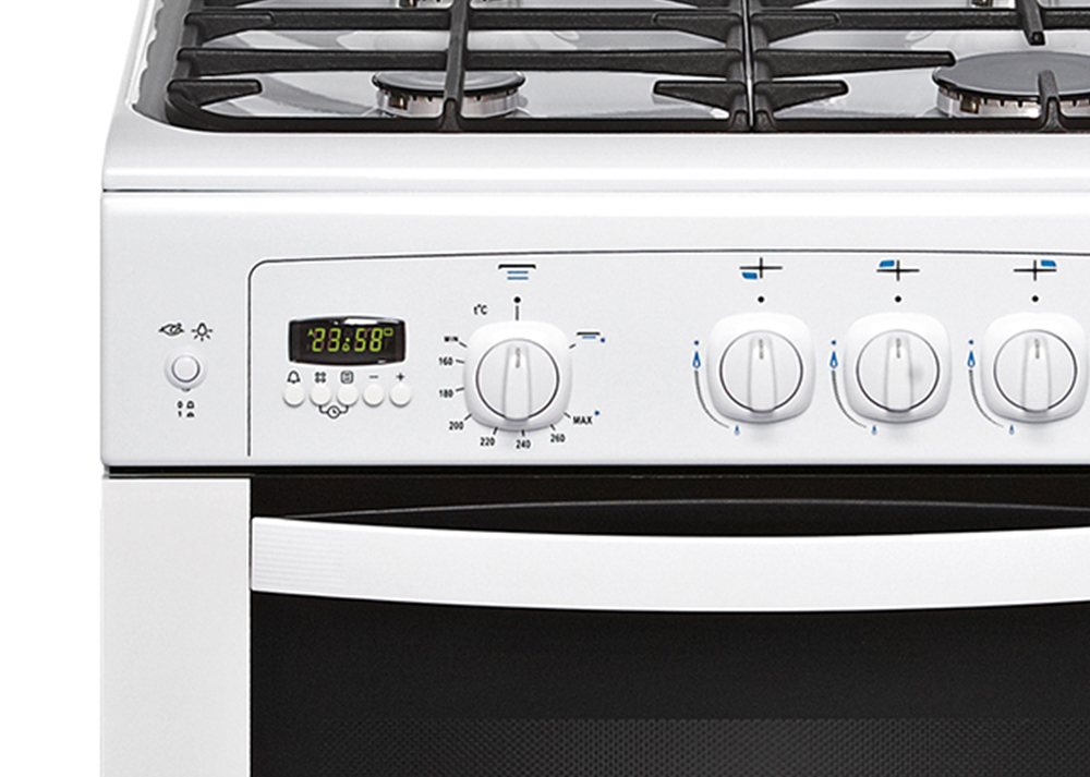 Электронный кнопочный таймер показывает текущее время и позволяет задать время работы устройства. Таймер может автоматически в назначенное время отключать горелки или духовой шкаф.